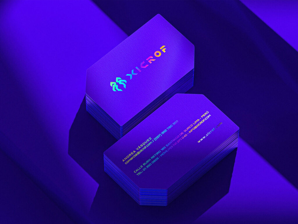以大膽飽和的電光紫色為主色調,Logo搭配霓虹光澤的燙金,極具未來感,使名片在光線下呈現出動態變化,這不只是張名片,更像是一張濃縮品牌精神的科技邀請卡,令人印象深刻。