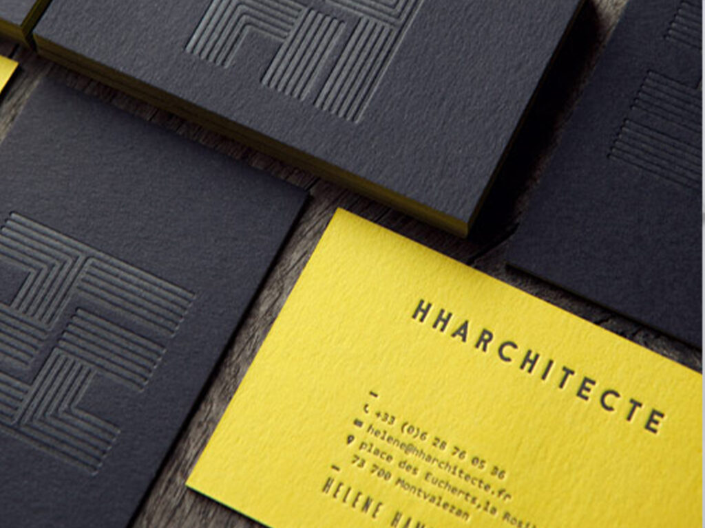 這款名片設計大膽運用黑黃撞色,營造出強烈的視覺對比。正面用凸版壓紋呈現建築感的幾何圖形標誌,整體簡約設計展現專業質感,適合建築師、設計師等創意專業人士使用。