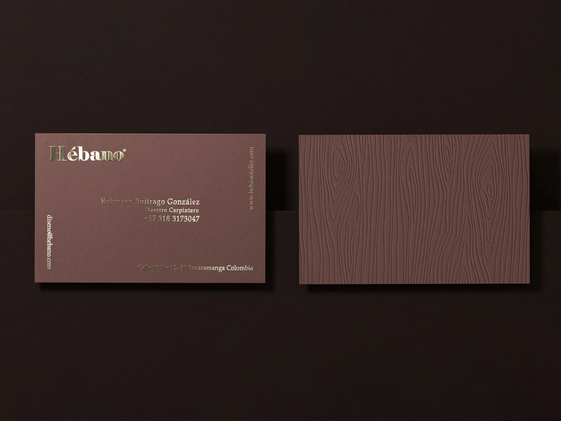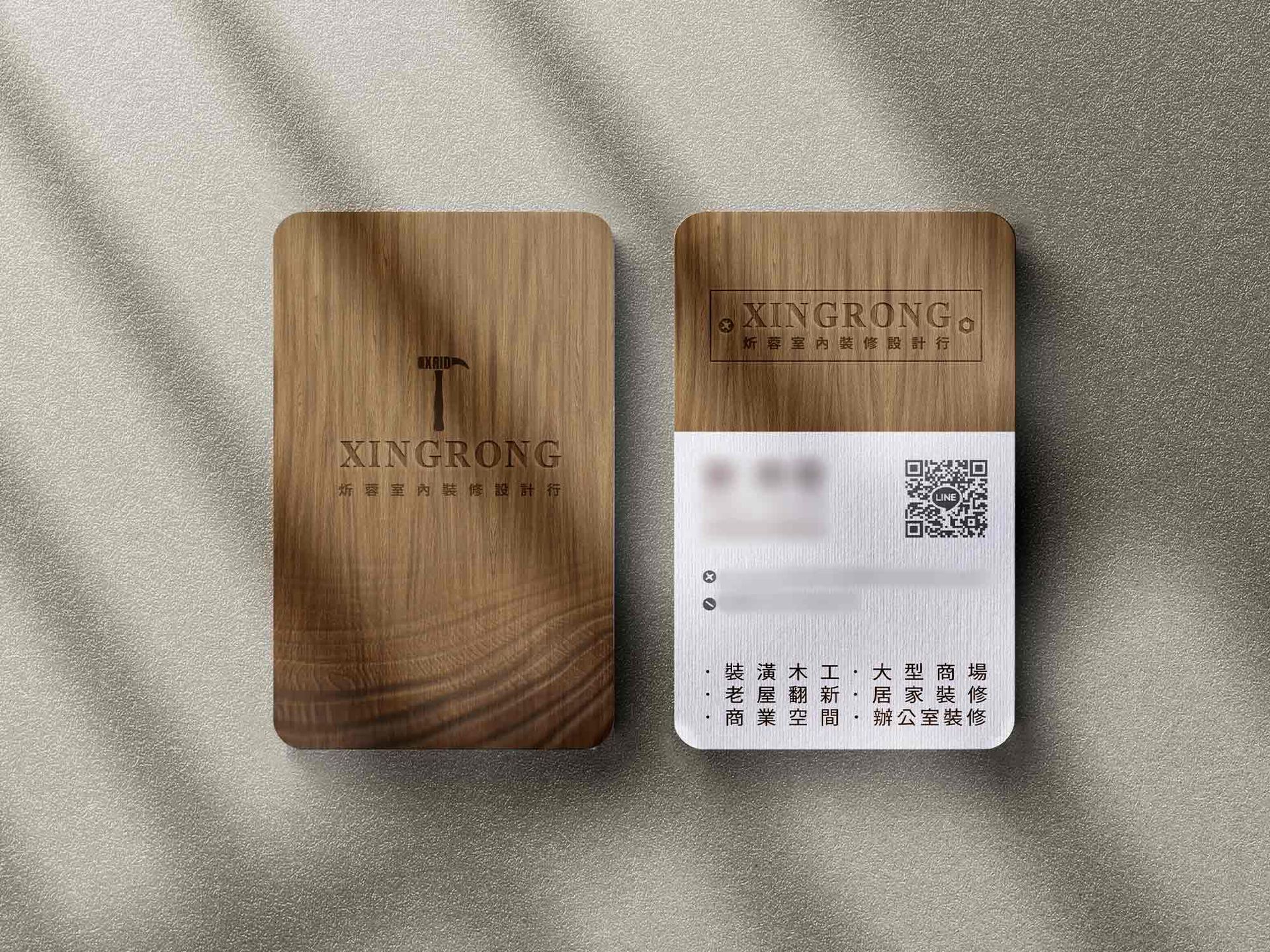 這款名片設計以大片木紋紋理呈現,彷彿一塊剛切割的實木板,展現品牌對工藝與材質的講究。搭配局部上光處理的鐵錘圖像,在光線下閃耀出細緻光澤,象徵專業與職人手作精神。