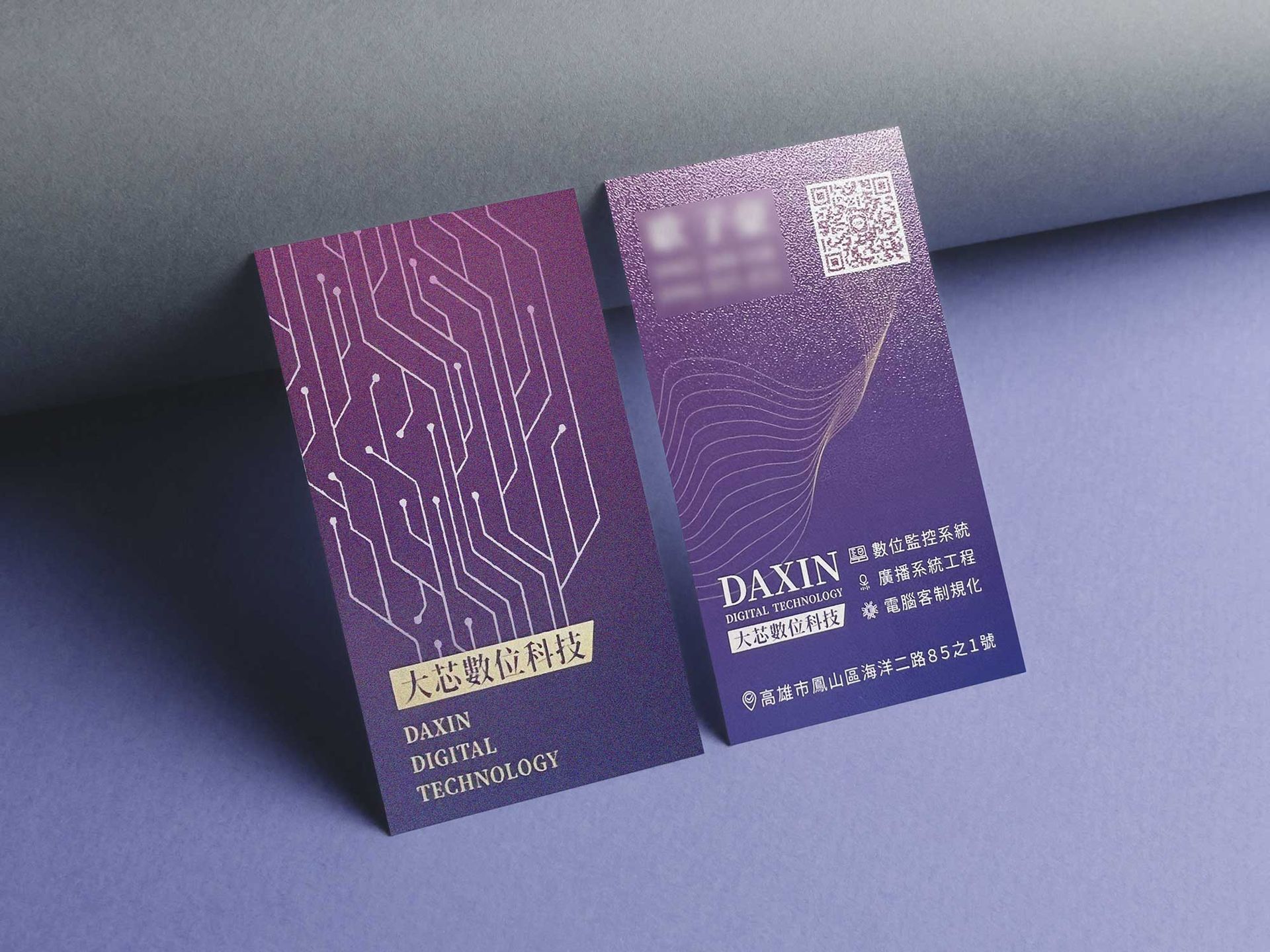 這款名片設計以漸層紫為基底,融合電路板線條與數位波紋,展現高度科技感與前瞻視覺。