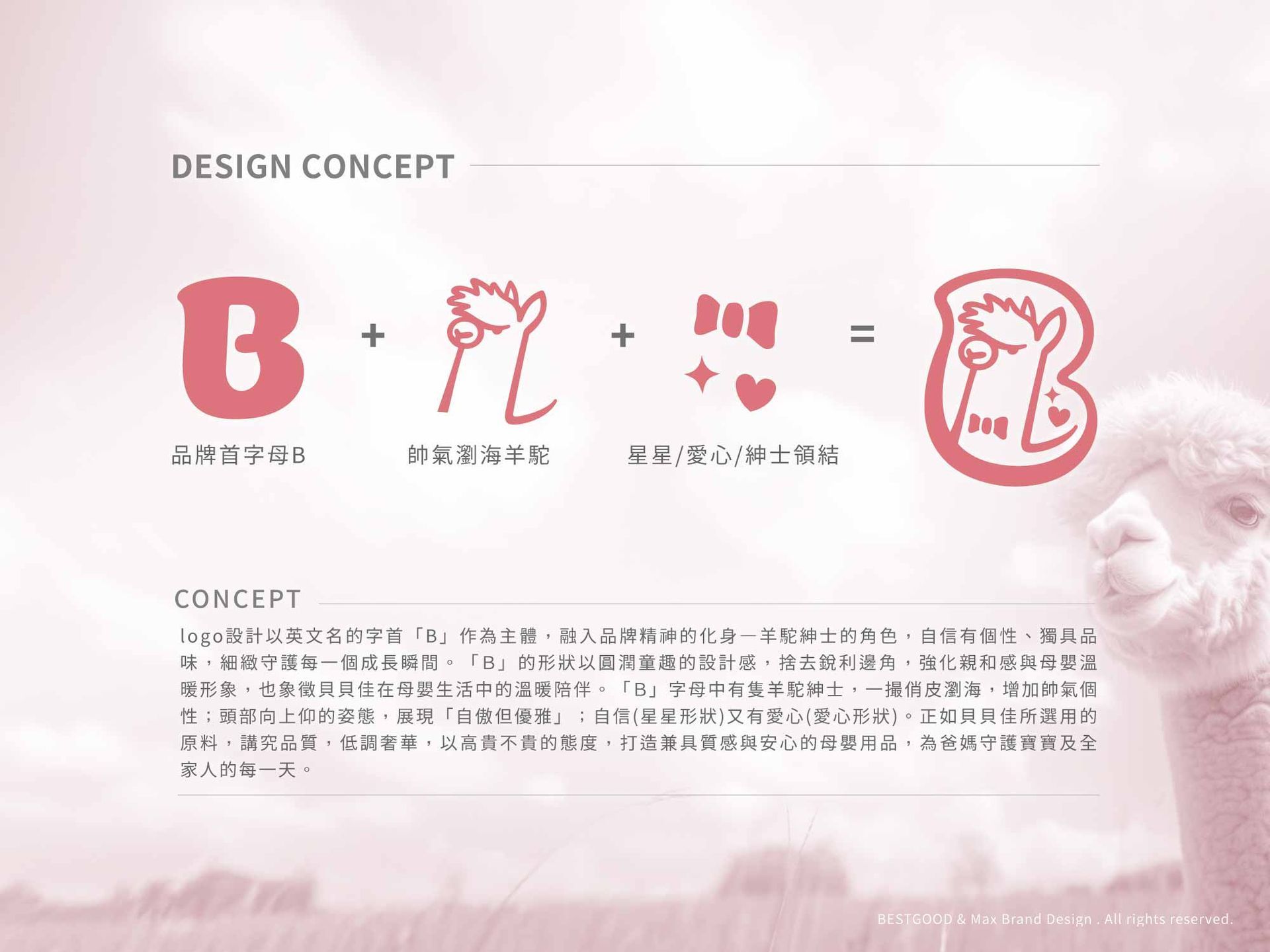 ✧ logo角色化設計,創造故事連結:將「B」字母結合羊駝圖像,賦予logo溫暖又個性的品牌故事。