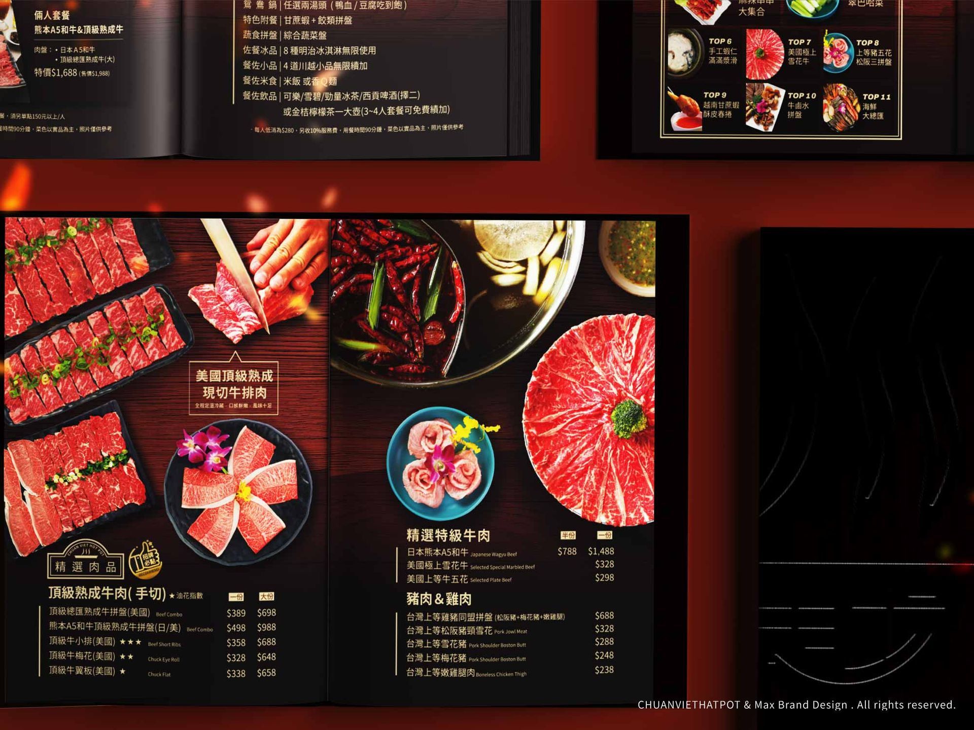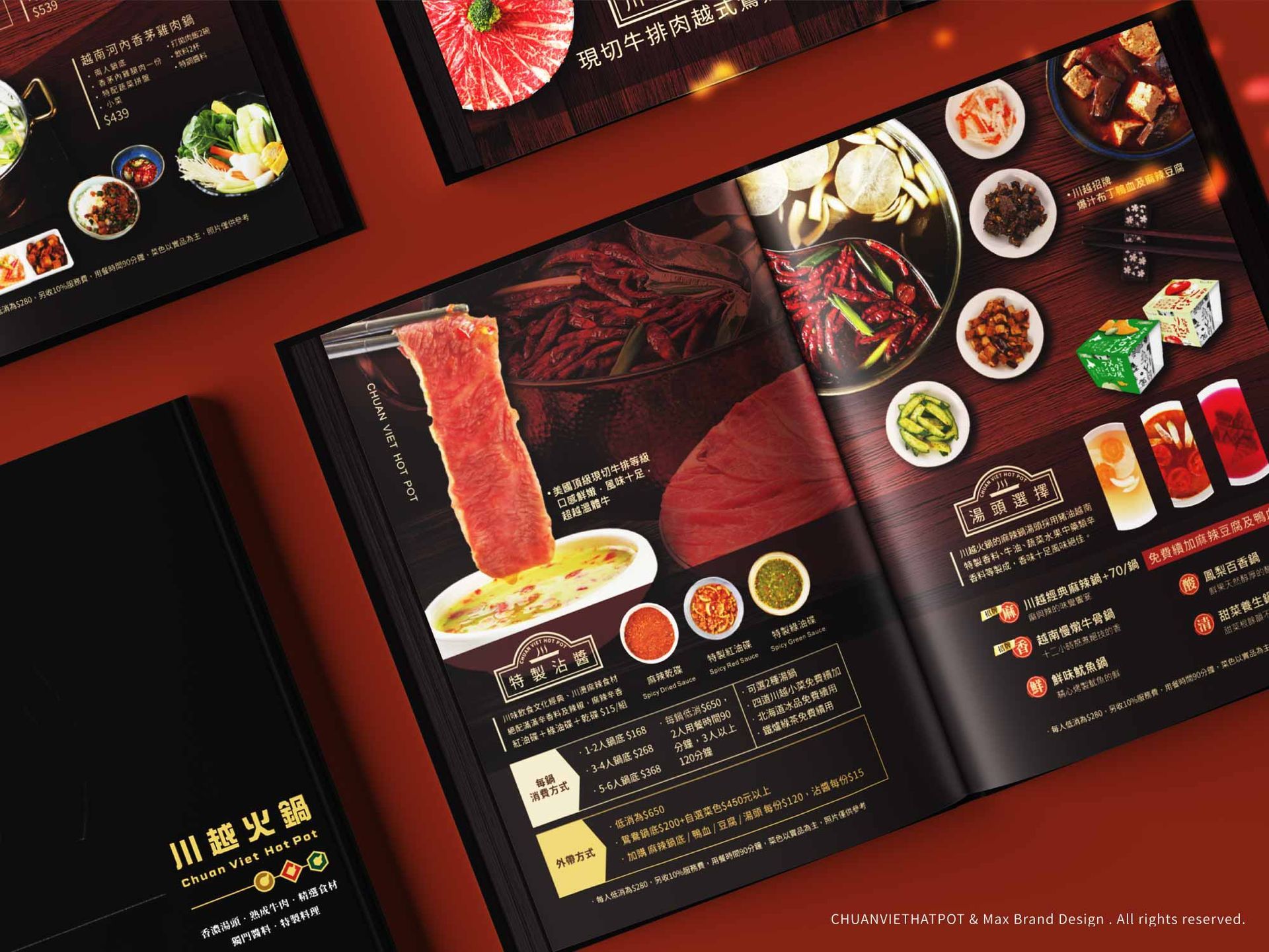 知心品牌設計以視覺與味覺同步的設計策略,打造讓人「一翻就餓」的菜單體驗,讓川越火鍋的品牌個性在每一頁中都鮮明登場。