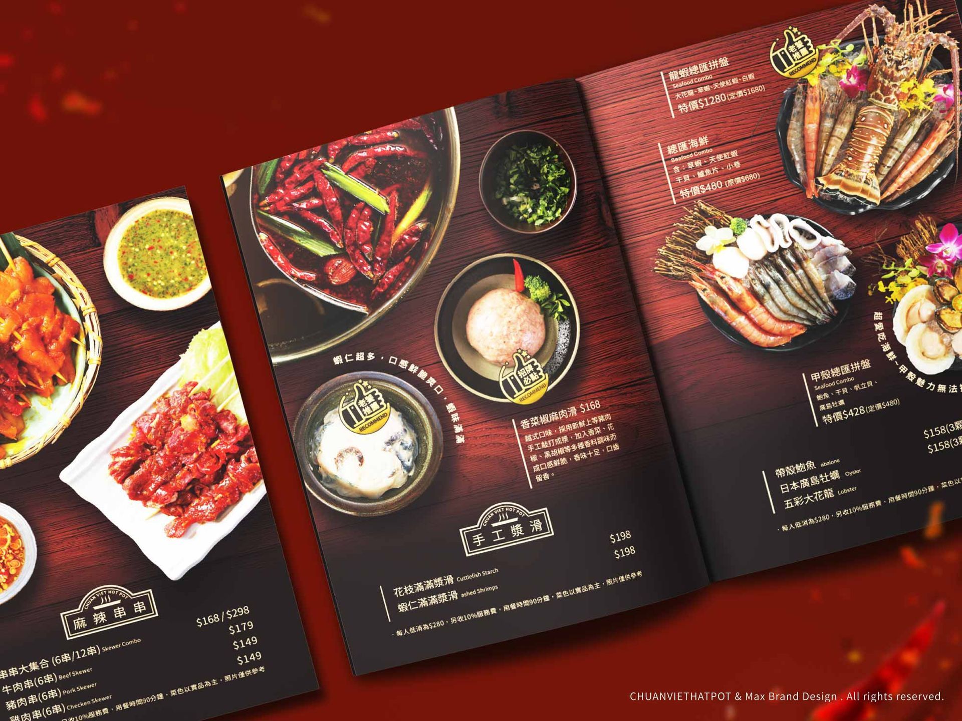 川越火鍋 Chuan Viet Hot Pot 的菜單設計,融合越南與川味麻辣的特色料理。菜單設計以咖啡紅的木紋底為背景,襯出火鍋與食材的美味,強調火鍋的麻辣熱度與越式料理的香氣層次,營造出「現煮感」的美味氛圍。