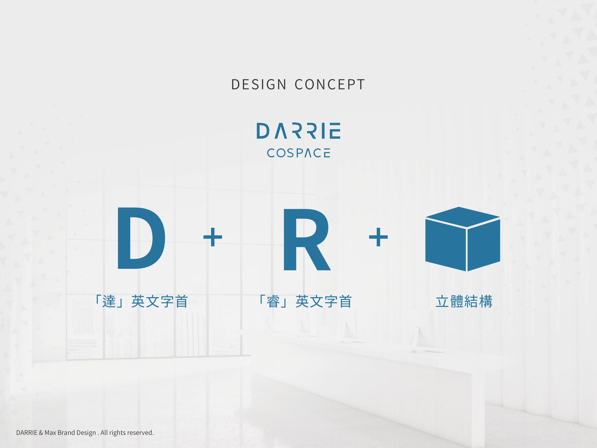 取「達睿」的「D、R」英文字母進行logo設計,透由D和R結合代表「融合」之意,並以三層結構的立體空間來呈現「多元」的商業模式,讓進駐的企業主都能夠透過達睿共享空間的平台融合,創造出新的商業模式。