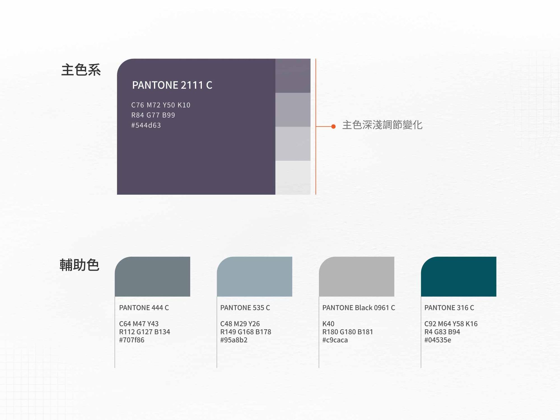 精準定義品牌主色與輔色,包括 CMYK、RGB、Pantone 色號。知心品牌設計透過穩重的中性色系,營造出專業而不失溫度的氛圍。